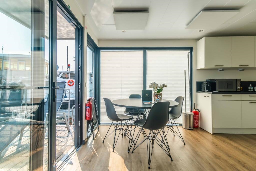 La houseboat offre une vue imprenable sur le navire emblématique Mercator ainsi que sur d’autres voiliers et bateaux à moteur. À bord, vous profitez de tout le confort nécessaire : deux chambres, dont une avec un lit double et une avec des lits superposés, ainsi qu’une salle de bain avec douche. La cuisine entièrement équipée comprend notamment un réfrigérateur, un lave-vaisselle et un four à micro-ondes. À l’extérieur, vous pouvez vous détendre sur votre terrasse privée au bord de l’eau ou sur le pont supérieur ensoleillé, l’endroit idéal pour se relaxer.